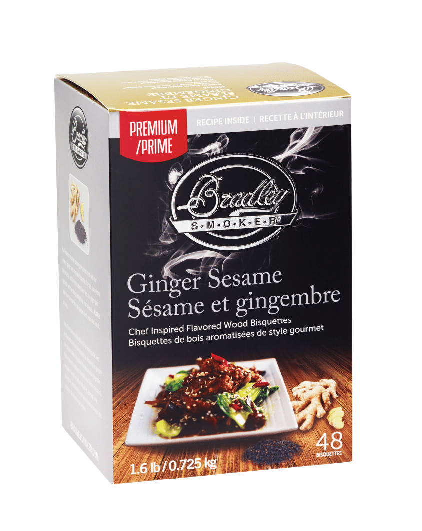 Bradley Smoker Premium Ginger Sesame Wood Bisquettes ® werden aus reinem Holz hergestellt. So können Sie Speisen mit purem, köstlichem Geschmack räuchern.